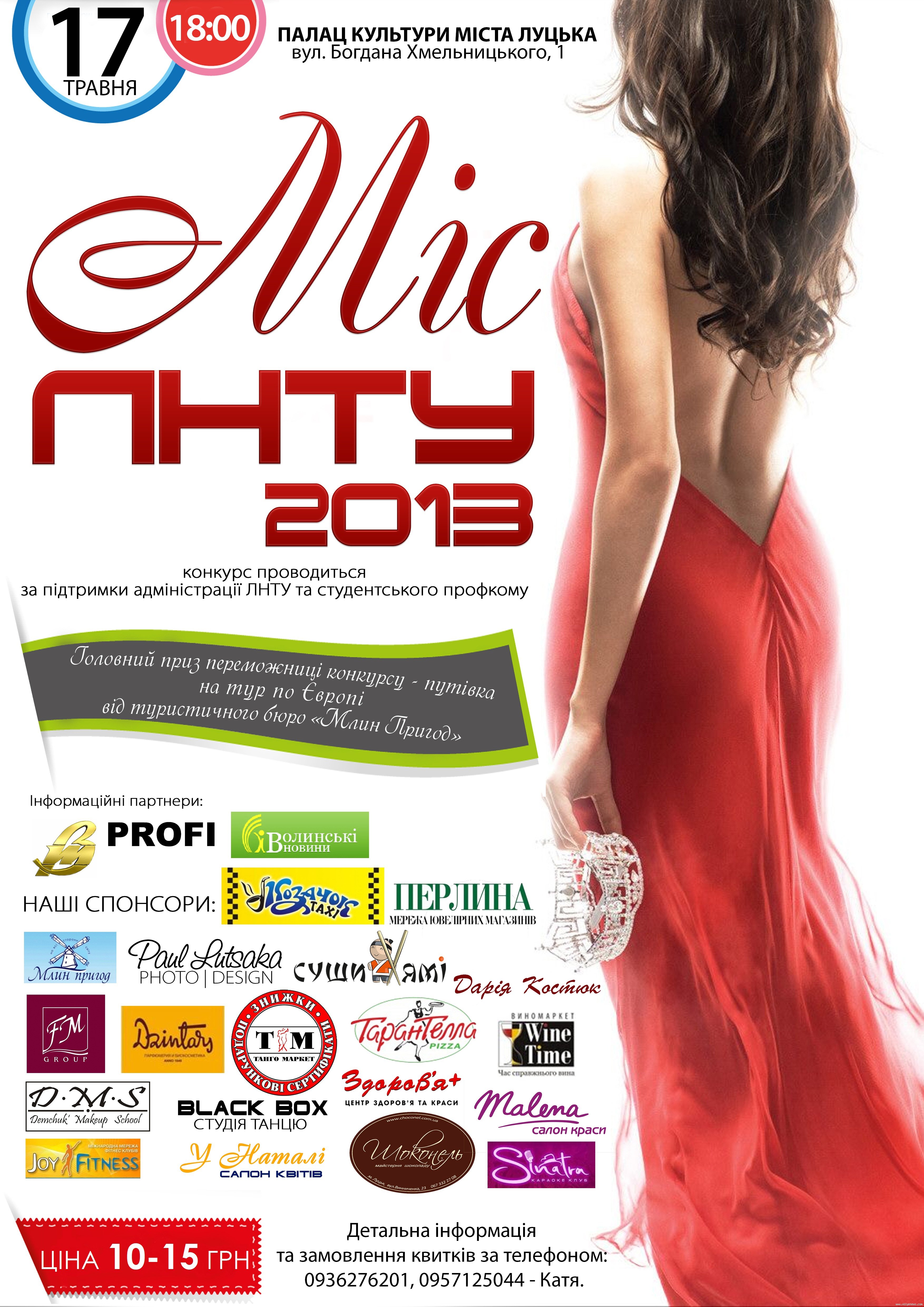 Конкурс краси «Міс ЛНТУ 2013» відбудеться сьогодні, 17 травня о 18:00 годині в Палаці культури Луцька. Його переможниця поїде у тур Європою.