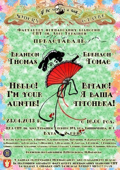 В актовій залі Центру культури та дозвілля Східноєвропейського національного університету імені Лесі Українки 23 квітня відбудеться англомовна вистава за п’єсою Брендона Томаса «Вітаю! Я ваша тітонька!» у рамках святкування Міжнародного дня солідарності молоді.