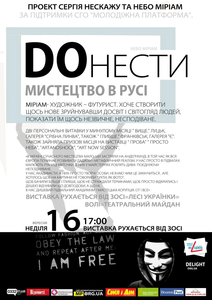 Як повідомили організатори, метою проекту є створення альтернативи пасивній галерейній виставці. Тож, своє «мистецтво в русі» у межах проекту «Doнести» покаже молода художниця під псевдонімом Небо Міріам.