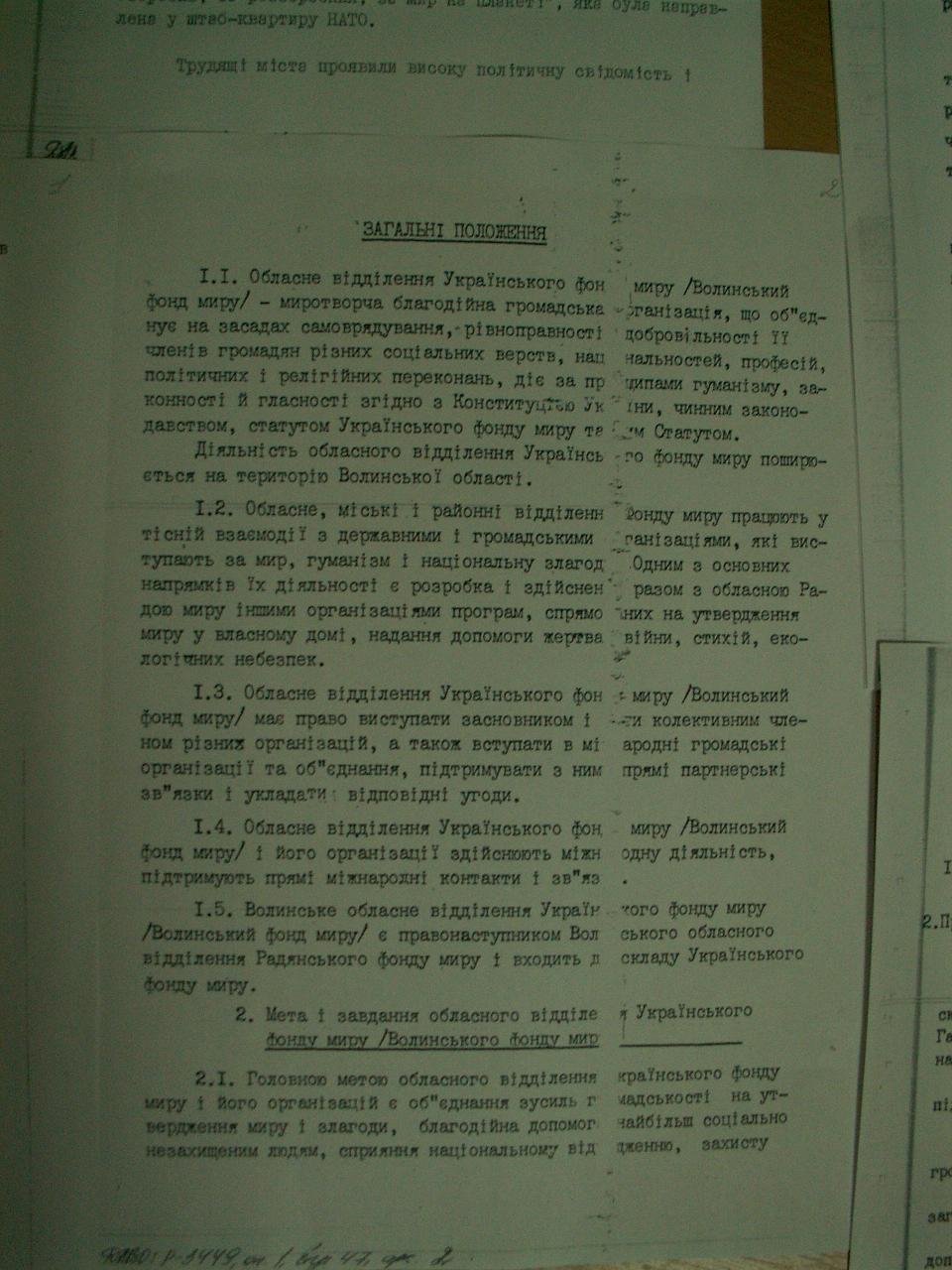 Начальник відділу інформації на використання документів Держархіву в області Любов Коць розповіла, що установа представила копії документів, які передані на збереження Волинським відділенням Українського Фонду Миру. Зокрема це Статут Волинського Фонду Миру, де описано усі аспекти діяльності організації.
