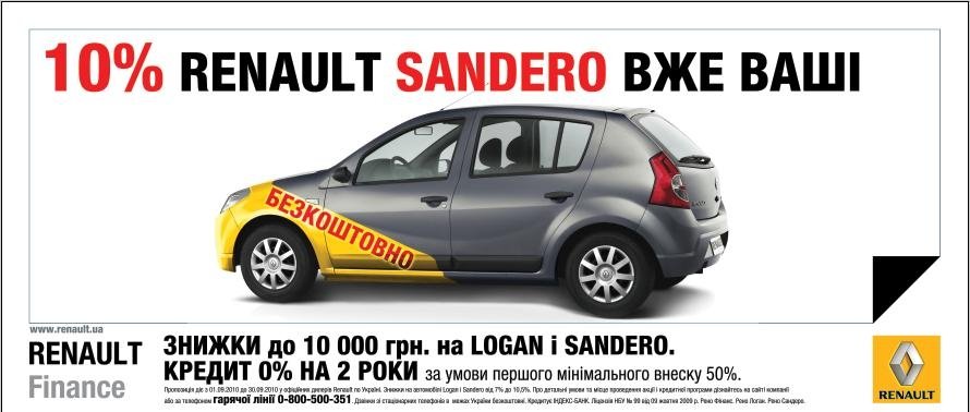 В компанії «Рено Україна» - нова акція: кожен, хто протягом вересня придбає автомобілі Renault Logan або Renault Sandero, отримає 10% автомобіля в подарунок.