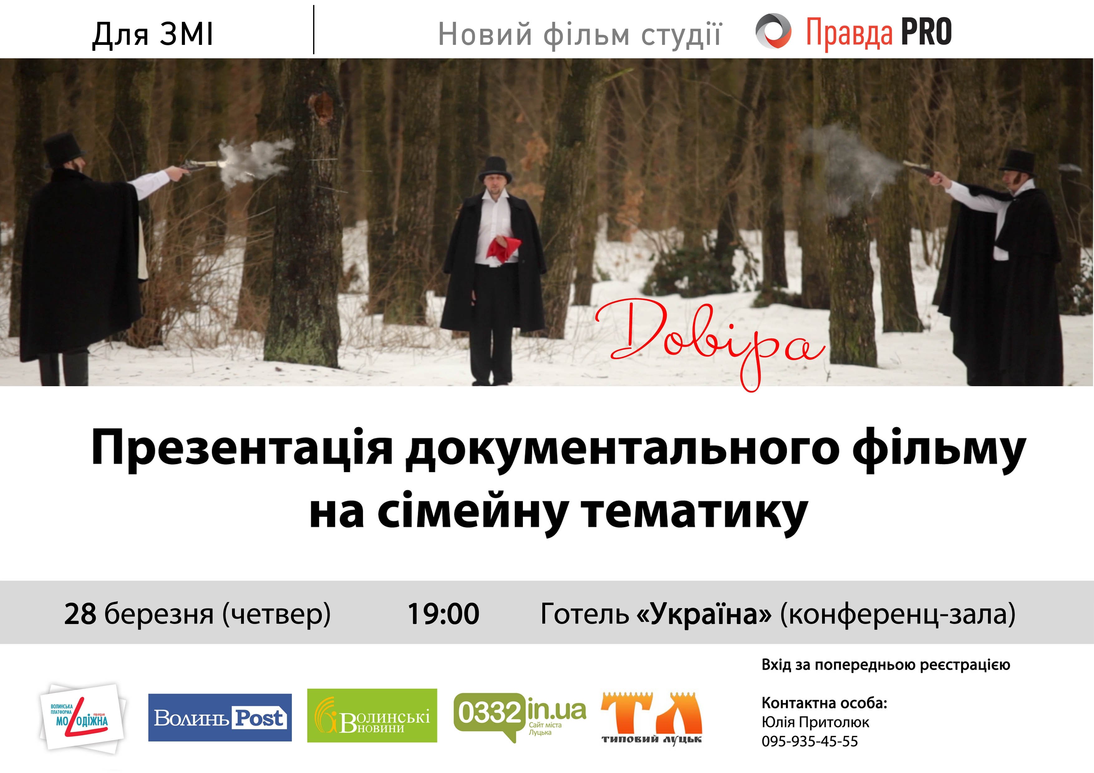 Презентація документального фільму студії «Правда PRO» «Довіра» на сімейну тематику відбудеться у четвер, 28 березня, о 19:00 у конференц-залі готелі Україна.