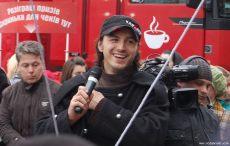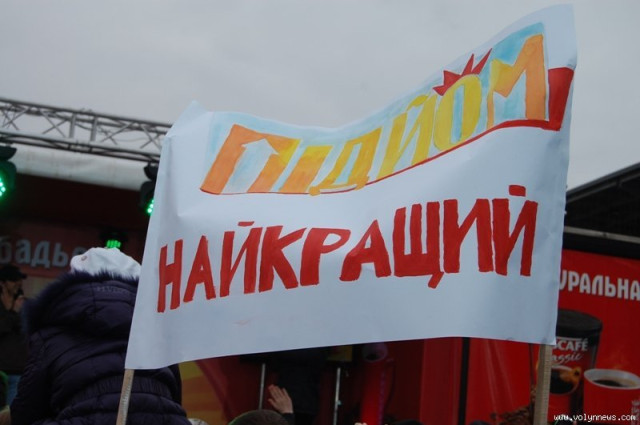 Притула «розігрівав» публіку футбольними темами: говорив про «найкращого футбольного тренера Віталія Кварцяного» та «кращий футбольний клуб «Волинь».