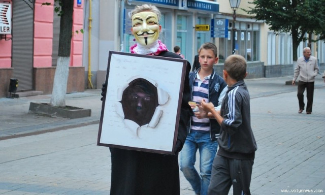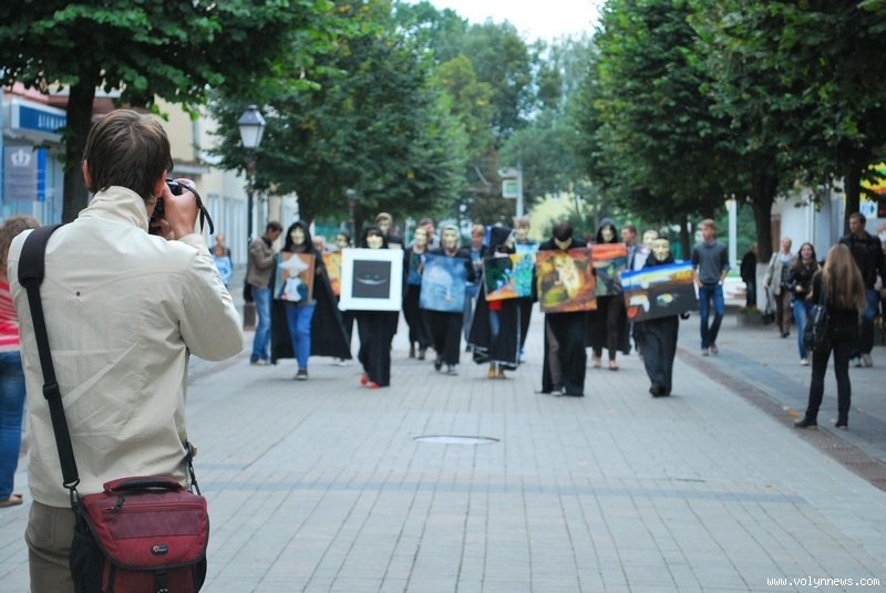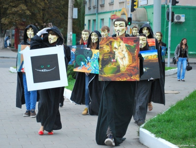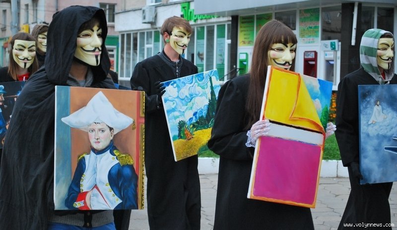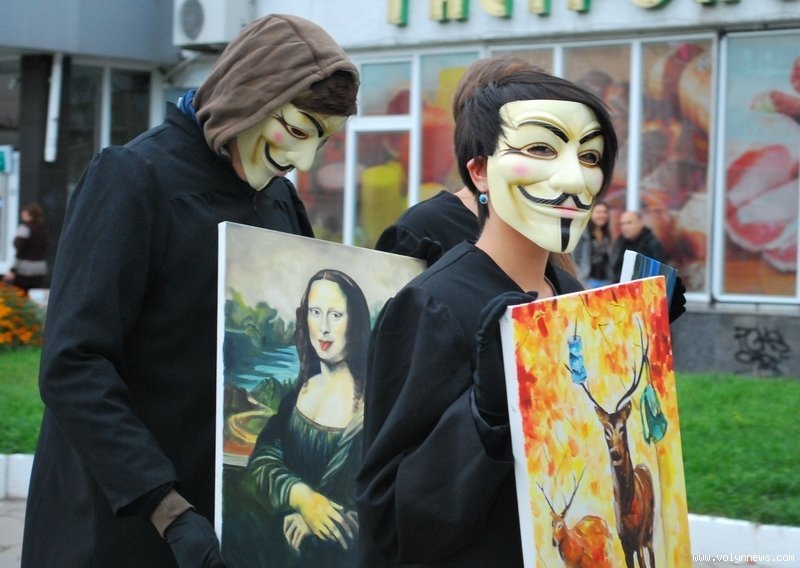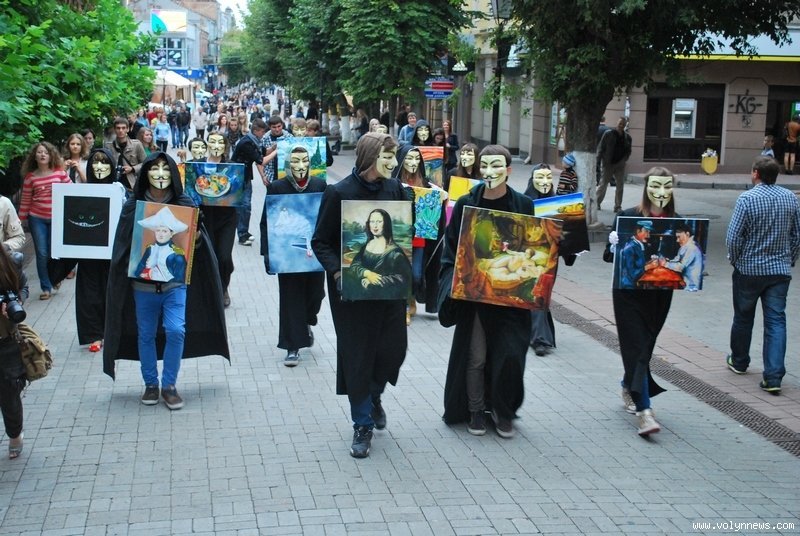 Луцька художниця, яка називає себе Небо Міріам, оригінально презентувала свої роботи. 15 молодих людей, одягнутих в маски з кінофільму «V означає вендета» та чорні плащі або мантії, носили картини центральними вулицями міста.