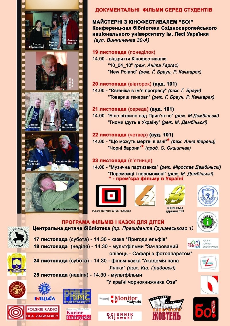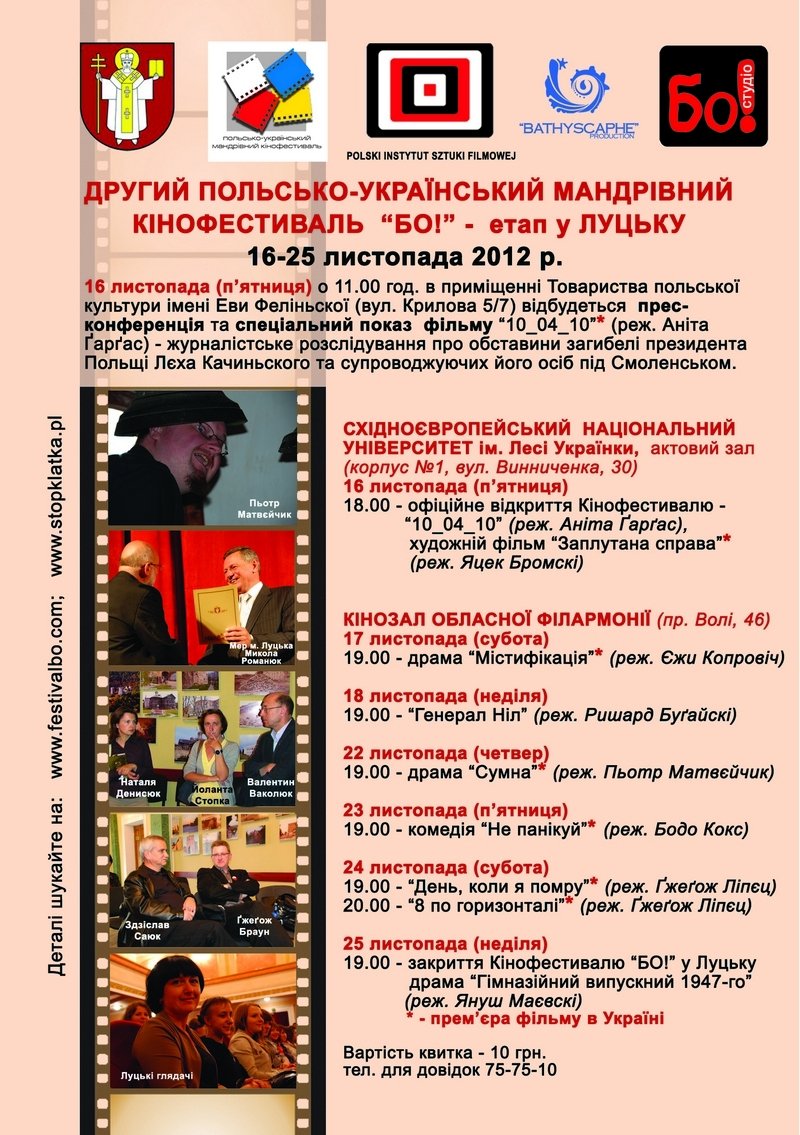 З 16 по 25 листопада за сприяння Польського інституту кіномистецтва відбудеться ІІ Польсько-український мандрівний кінофестиваль «БО!». Нагадаємо, що в минулому році захід відбувся 23-25 вересня під патронатом Луцького міського голови Миколи Романюка.