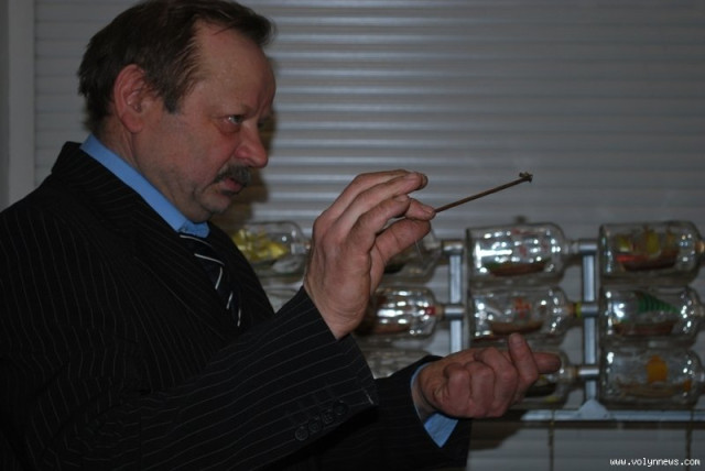 Під час відкриття виставки Ящук поділився з присутніми секретами виготовлення вітрильників і продемонстрував інструменти і техніку, які дозволяють помістити кораблі у пляшки.