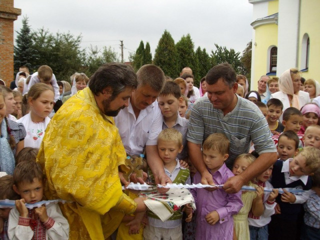 Вітаючи присутніх, зазначив: «Церковна громада гуртується не тільки для спільної молитви, а й для служіння в багатьох інших напрямках. І зараз наша мета – звернути увагу батьків на дозвілля дітей. Краще нехай вони бавляться на цьому майданчику, ніж постійно дивляться телевізор чи граються на комп’ютері», - зазначив отець Михайло.