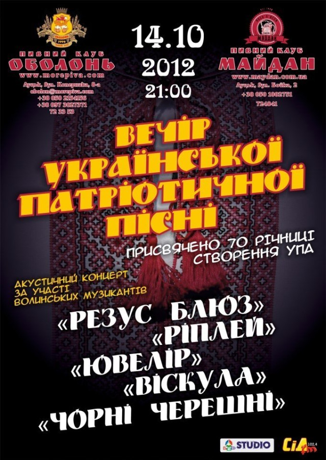 Вечір української патріотичної пісні відбудеться у пивному клубі «Майдан» на свято Покрови, 14 жовтня.