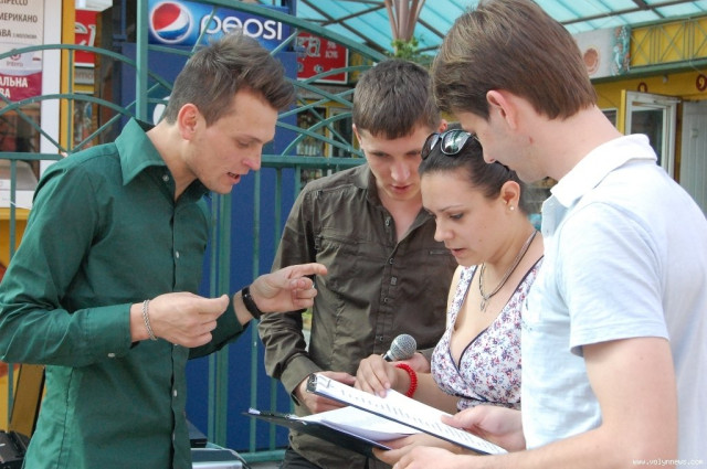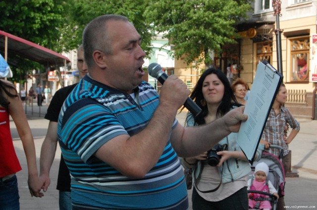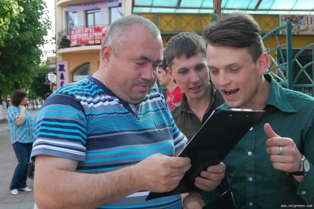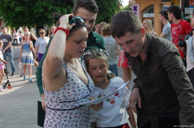 Після цього люди почали активніше долучатися до заходу і уже невдовзі з’явилася навіть черга з охочих заспівати. Так, після дівчини виступив лучанин Петро, який обрав пісню «День Победы», і також отримав подарунок.