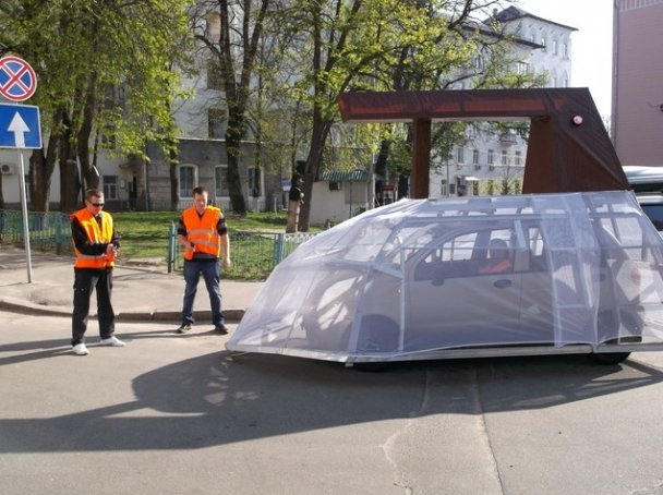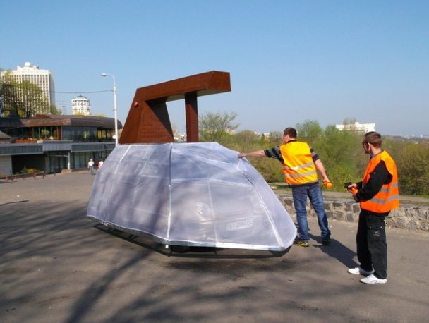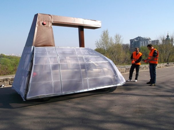 «На цій машині ми плануємо виїжджати на проблемні ділянки доріг у Києві, щоб показати чиновникам, що наші дороги не ремонтують, а всього лише прасують, викидаючи на вітер мільйони. Днями ми вже проїхалися праскою по Хрещатику і Володимирській», - поділився скульптор. Нагадаємо, автодорівці грають на дорогах в карти замість класти асфальт. За два роки на дороги виділили 17 мільярдів гривень, але ні на зарплату ремонтникам, ні на рівний асфальт «Укравтодору» так і не вистачило.