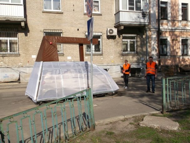 Художник створив арт-об'єкт на колесах у вигляді праски. За словами скульптора, інсталяція уособлює бездіяльність «Укравтодору». Скульптура складається з білої накидки, яка одягається на малолітражку Скритуцького та з коричневою ручкою як у праски.