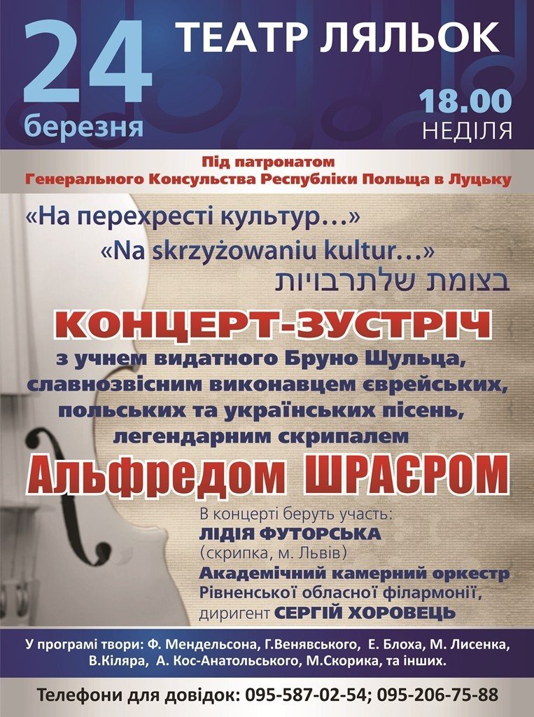 Концерт-зустріч із учнем видатного Бруно Шульца, відомим виконавцем єврейських, польських та українських пісень, легендарним скрипалем, лауреатом численних конкурсів, кавалером орденів багатьох країн дев’яносторічним Альфредом Шраєром.
