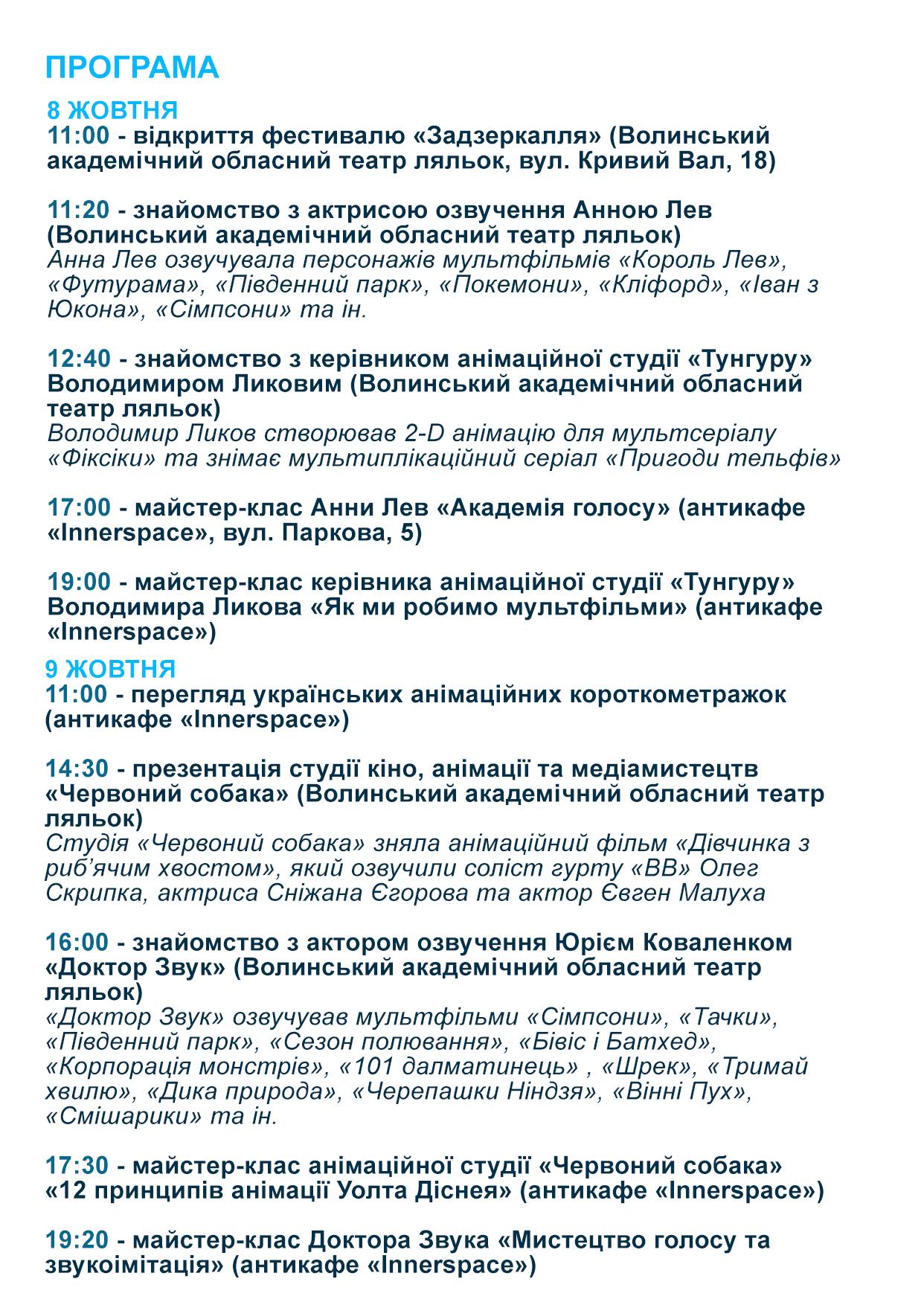З’явилася програма анімаційного фестивалю «Задзеркалля», який відбудеться у ці вихідні у Луцьку.