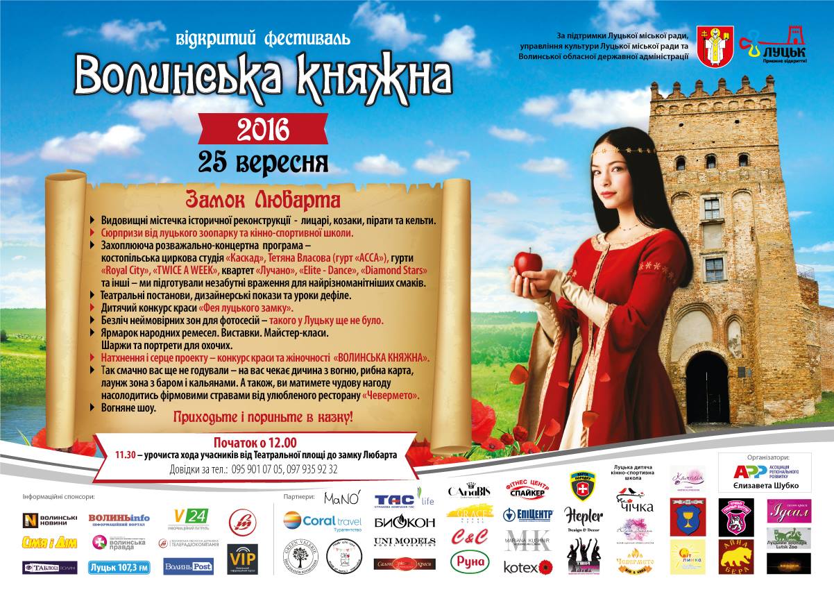 Знаковою подією у культурному житті Луцька стане фестиваль історії, краси і жіночності – «Волинська княжна», що 25 вересня 2016 року втретє відбудеться на теренах історичної пам’ятки обласного центру – замку Любарта.