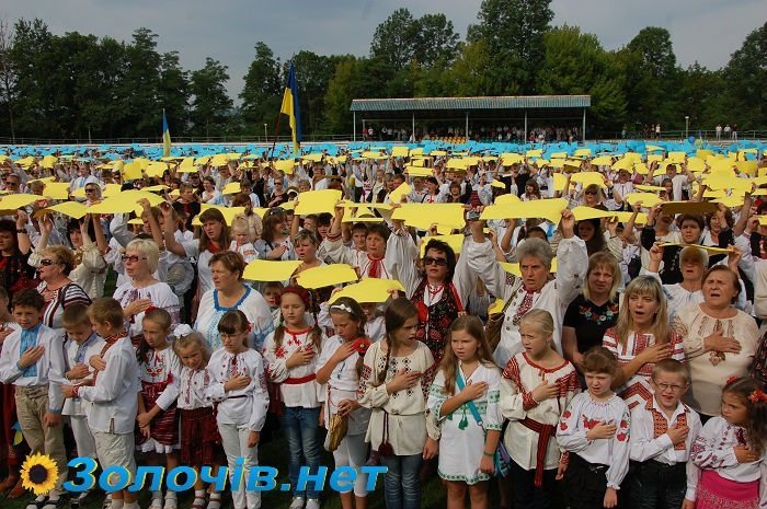 Люди заспівали «Ще не вмерла» на центральному стадіоні міста. По тому вони підняли над головами по аркушу жовтого і синього кольору – відповідно до розташування. Внаслідок цього на полі золочівського стадіону «утворився» державний прапор України.