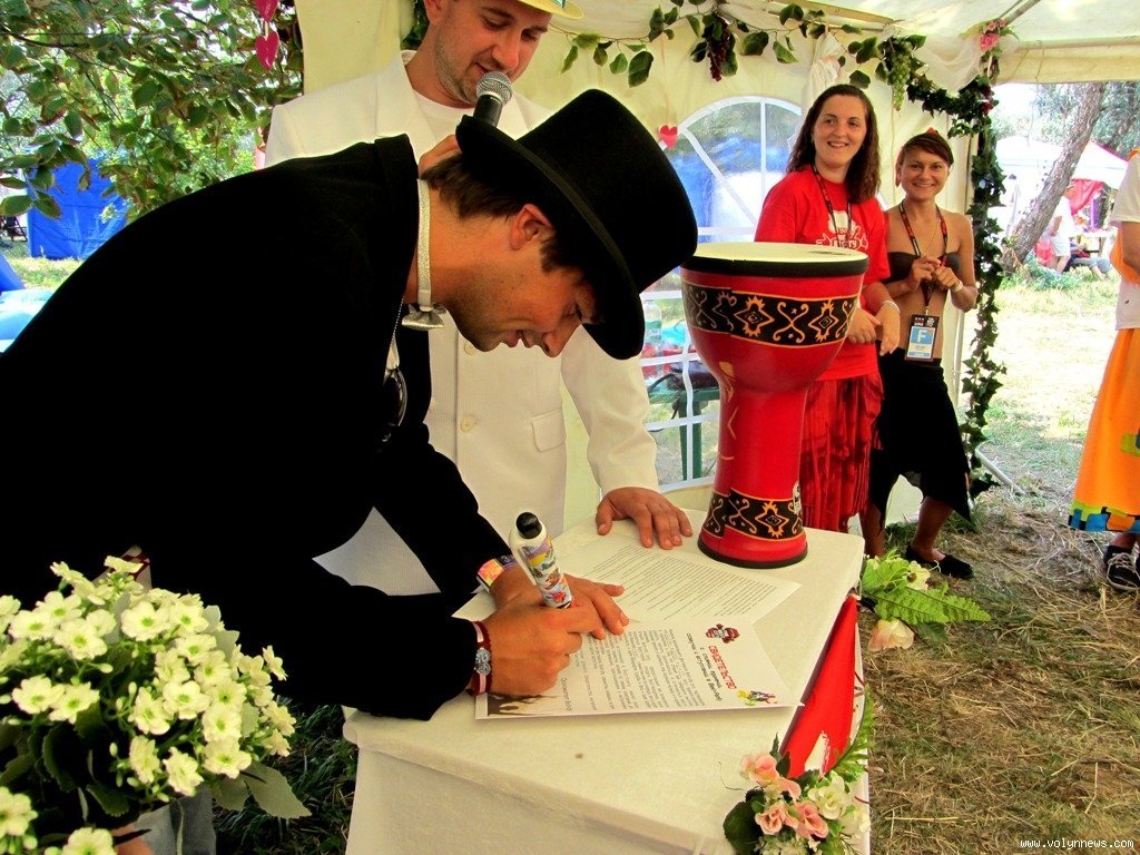 «Готовы ли вы соединить звуки в один аккорд , свои мелодии в один плейлист, и готовы ли Вы слабать один длинный концерт?», - запитував він у наречених.