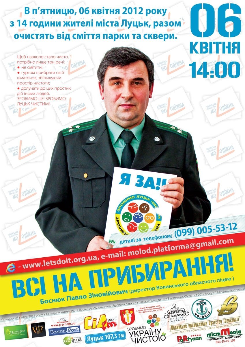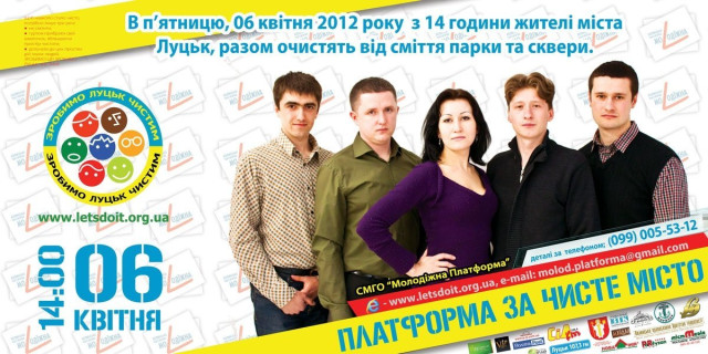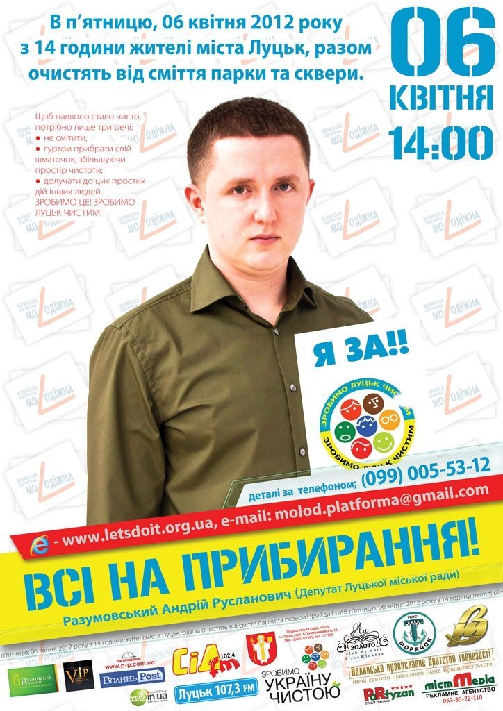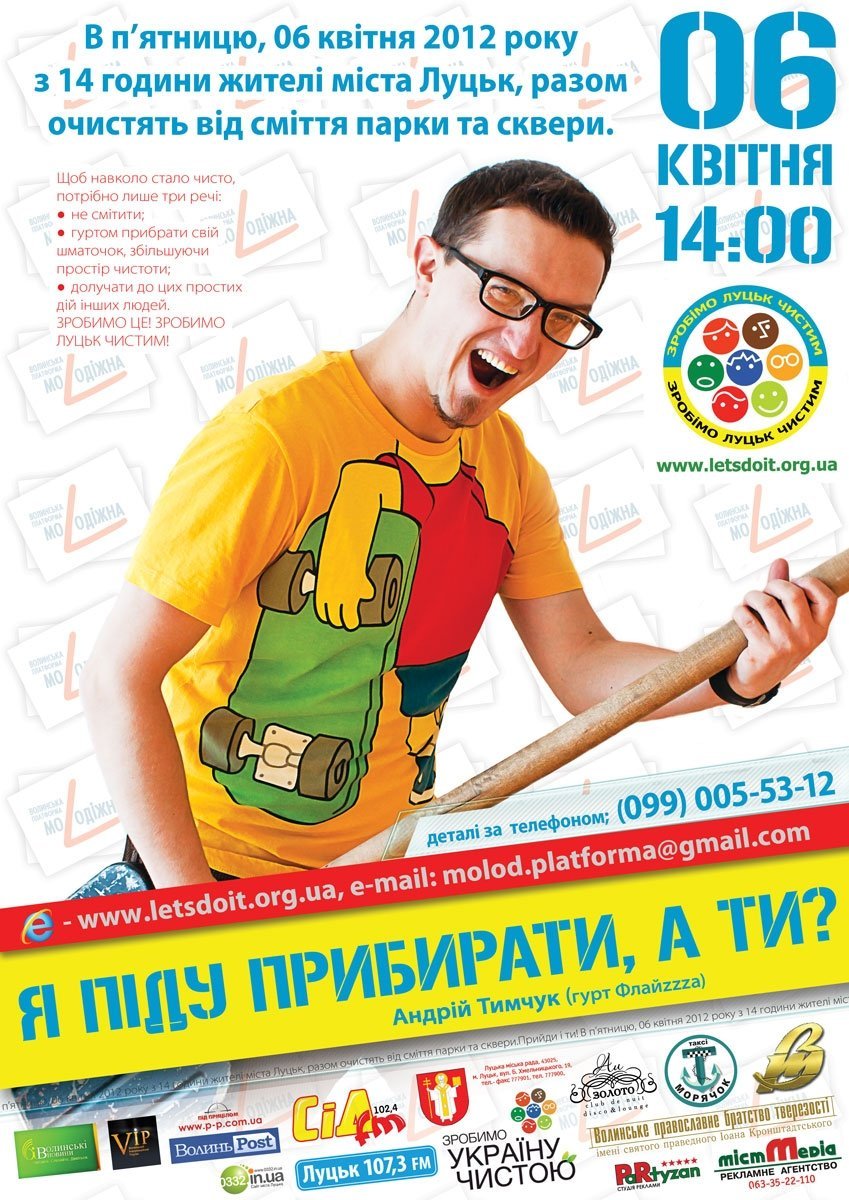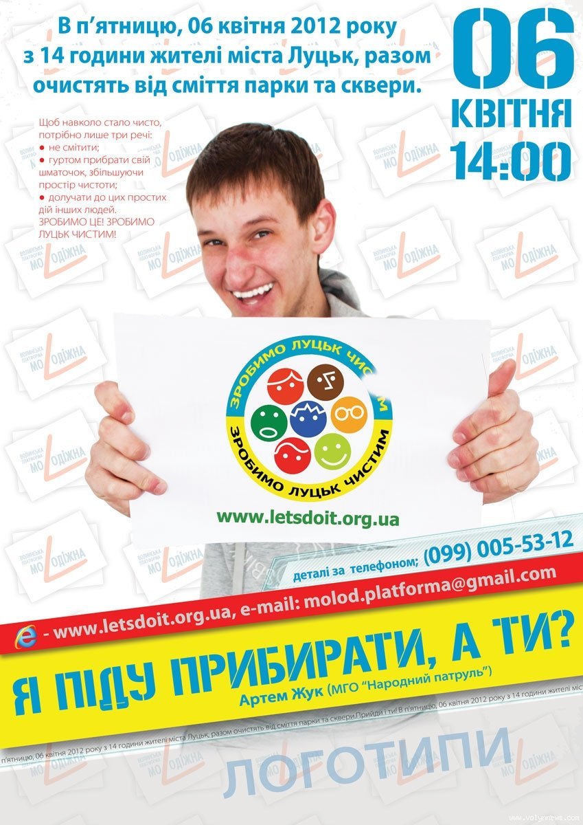 Як розповів один із організаторів акції Захар Ткачук, до прибирання міста зголосилося чимало відомих у Луцьку людей. Багато із них погодилися сфотографуватися для пропагування прибирання у Луцьку. Так, згідно із планами організаторів, афіші мали бути розташовані на сіті-лайтах у місті.