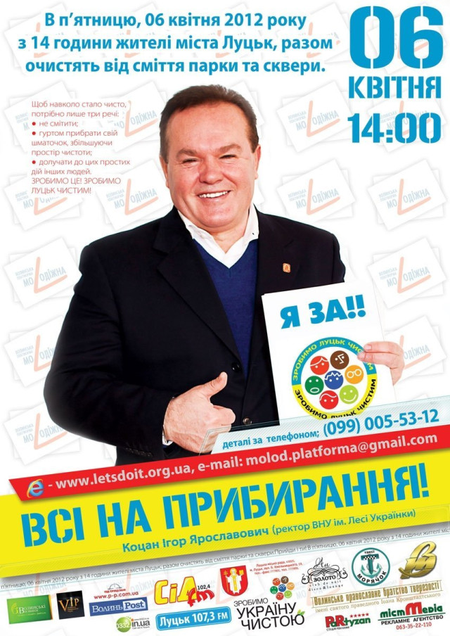 3. Реклама для такої акції - першочергове завдання. Мета - залучити простих громадян до чистоти і прибирання. Ніхто не прибере Луцьк в корінь при будь-яких варіантах, але свідомість тих хто там буде зміниться ...