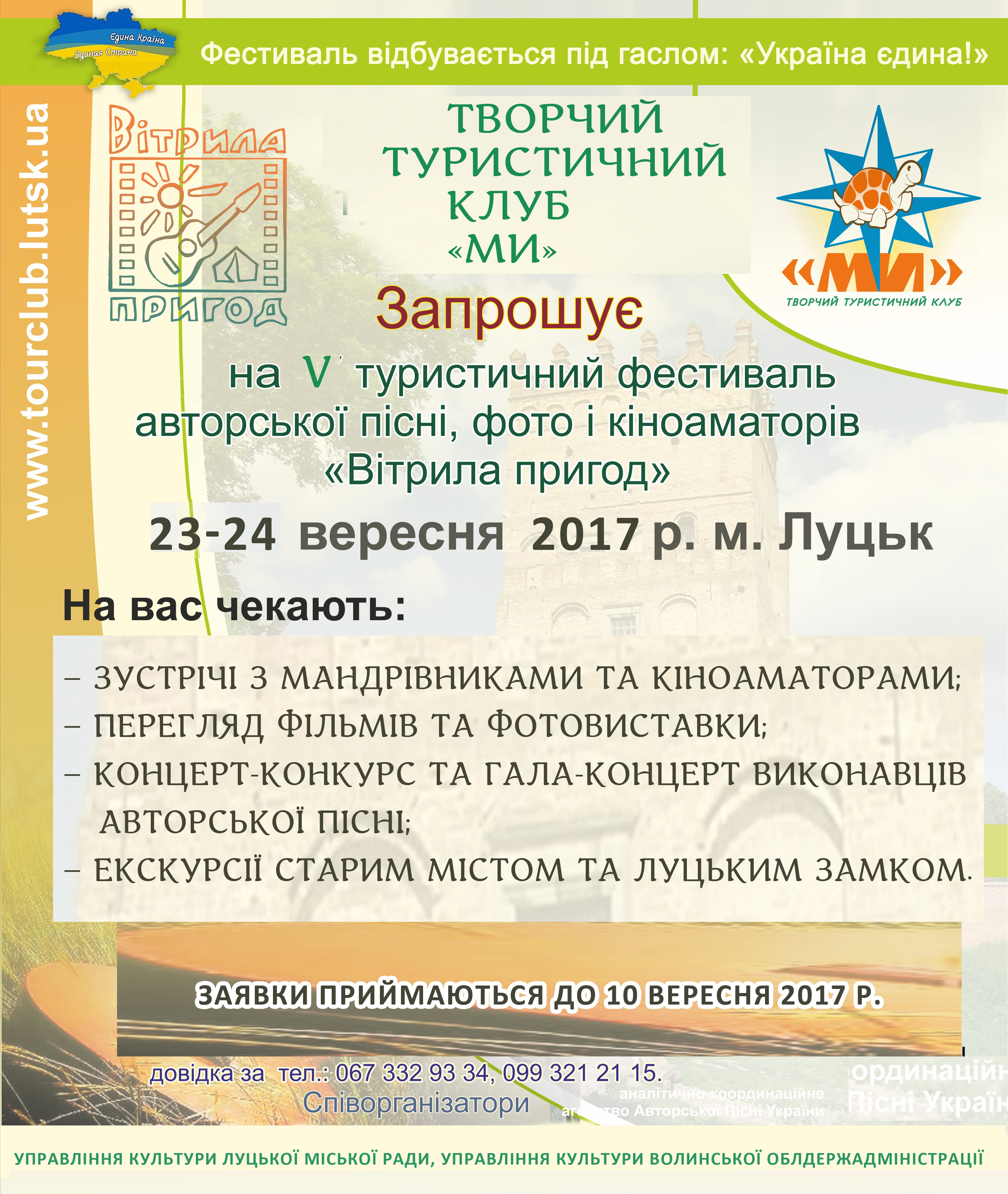 Творчий туристичний клуб «Ми» запрошує до древнього Лучеська на V туристичний фестиваль авторської пісні, фото- і кіноаматорів "Вітрила пригод", який відбудеться 23-27 вересня 2017 року, повідомляють організатори заходу.