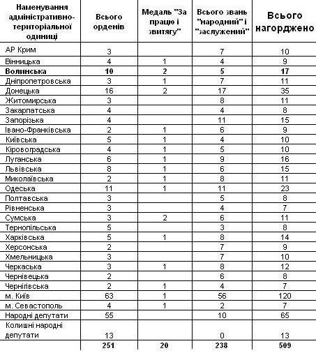 Волинь за кількістю нагороджених «обійшла» такі густонаселені регіони як Київська (10), Полтавська (8), Херсонська (9) області, переважила мільйонників - Львівську (15), Дніпропетровську (11), Харківську (14) області. Рівненська область отримала лише 7 нагород.