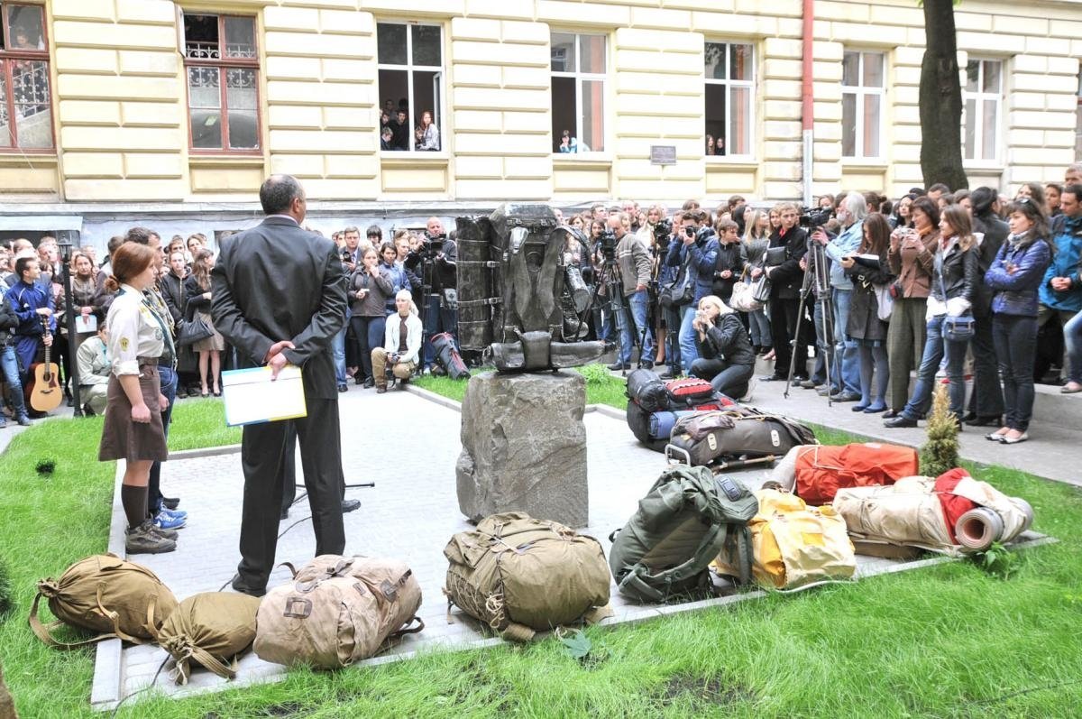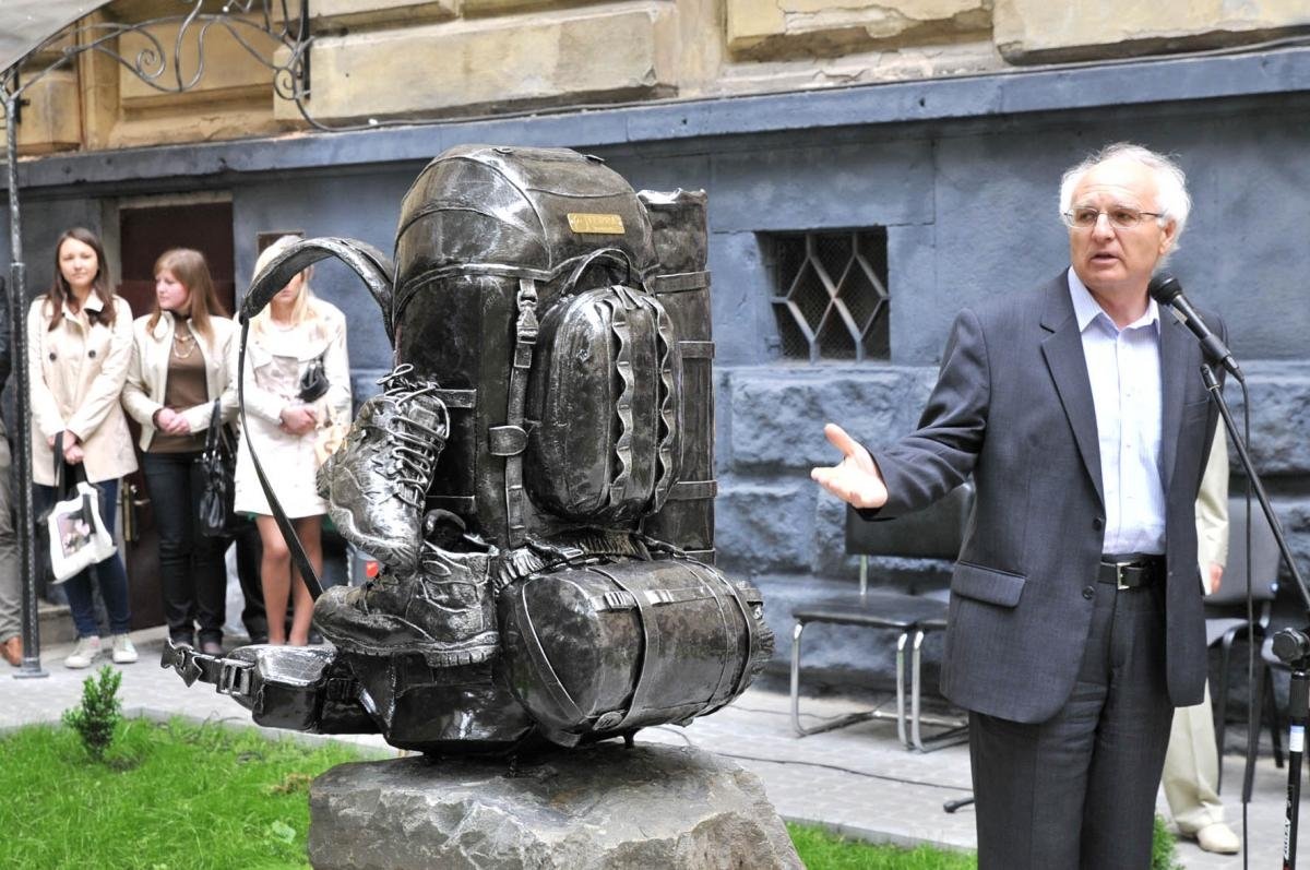 Памʼятник наплічнику відкрили у дворі географічного факультету Львівського національного університету імені Івана Франка.
