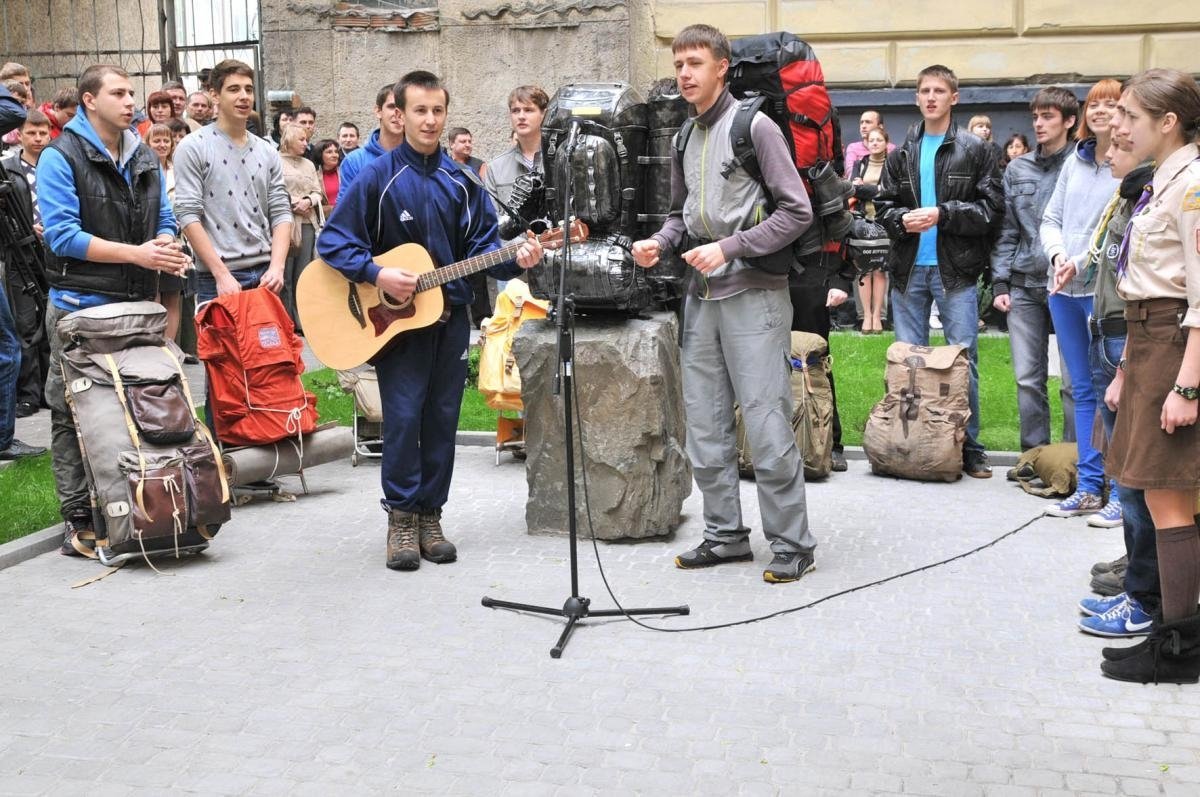 «Ідея встановлення памʼятного знаку наплічнику належить випускникам та студентам географічного факультету, ‒ каже Володимир Монастирський, кандидат географічних наук, викладач кафедри туризму географічного факультету ЛНУ імені Франка. ‒ Наплічник символізує багаж досвіду, який є у кожного за плечима. Тут ‒ усе необхідне спорядження, від якого часом залежить і людське життя».