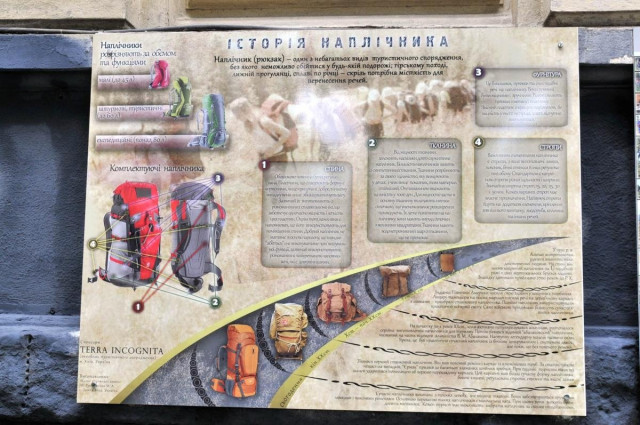 До слова, поруч, на стіні будинку, розмістили стенди, які розповідають про історію створення наплічників.