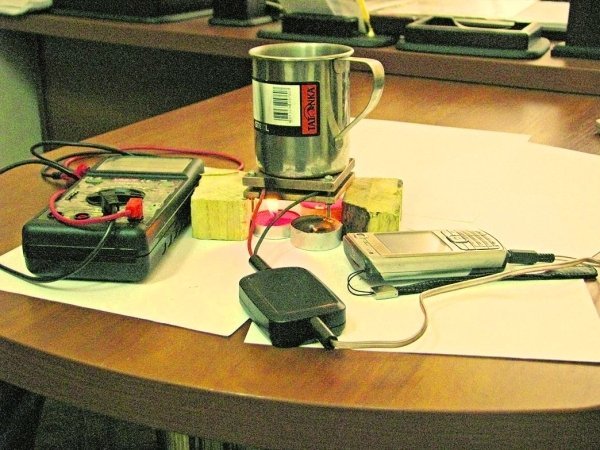 «Струм від пластини надходить спочатку в перетворювач, а потім ‒ у телефон, таким чином телефон заряджається. Поки внизу пластини буде гаряче, а вгорі ‒ прохолодно ‒ телефон заряджатиметься. Вода зверху повинна бути прохолодною, щоб забезпечити різницю в температурі. Вистачає води температурою 40 градусів», ‒ розповідає Сухов.