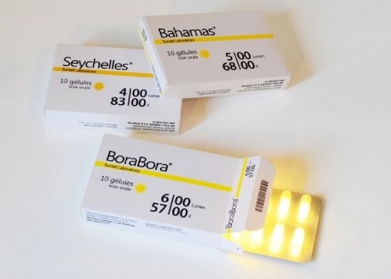 Французька компанія Sunset Laboratories випустила таблетки сонячного світла з популярних курортів. Ті, мовляв, допоможуть з депресіями, надмірною примхливістю та млявою шкірою.