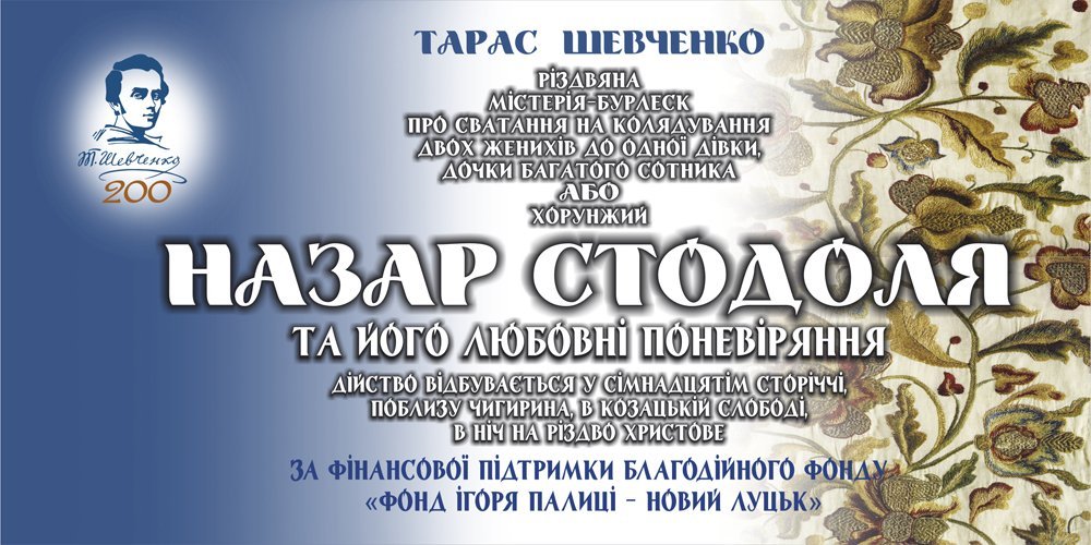 Вистава «Назар Стодоля» створена з нагоди 200-річчя від дня народження Тараса Шевченка у рамках реалізації програми благодійного фонду «Культура та духовність – головне багатство лучан». Таким чином, фонд реалізує одні з основних завдань діяльності у межах програми: популяризація українського слова, традицій і культури, вшанування пам’яті Великого Кобзаря, а також підтримує творчий колектив Волинського академічного обласного українського музично-драматичного театру імені Лесі Українки.