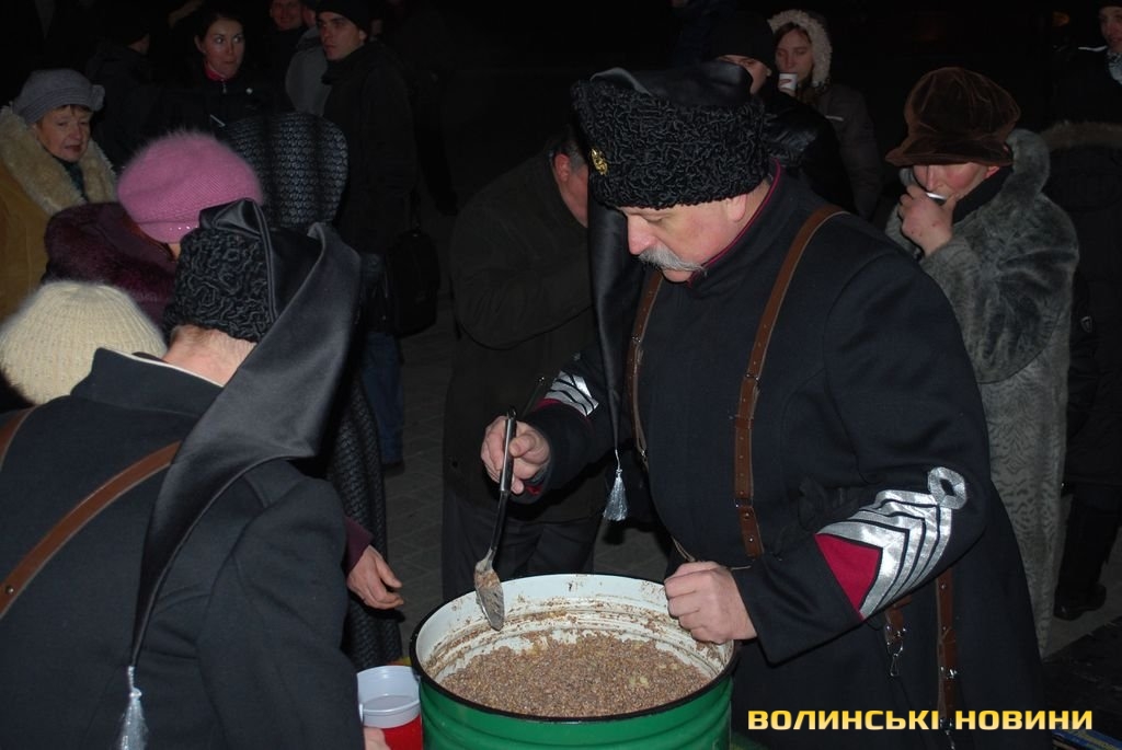 Як і завдено на Багатий вечір, ласували присутні і традиційною різдвяною стравою – кутею. Пригощав присутніх особисто отаман Козацького стрілецького братства Віктор Федосюк. «Горіхів та меду неміряно, конями возили!», - хвалив та запрошував скуштувати справжньої отаманської куті головний козак Волині.