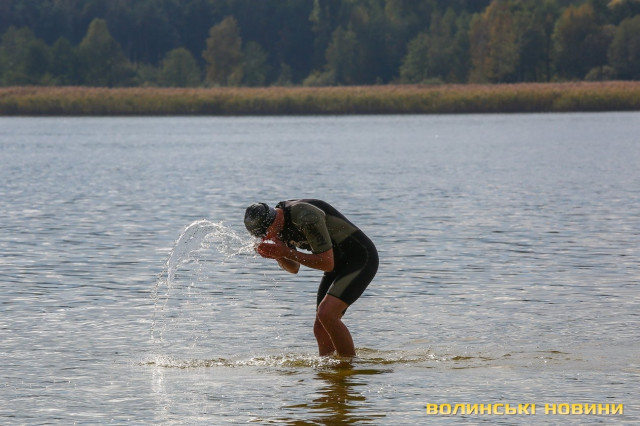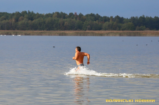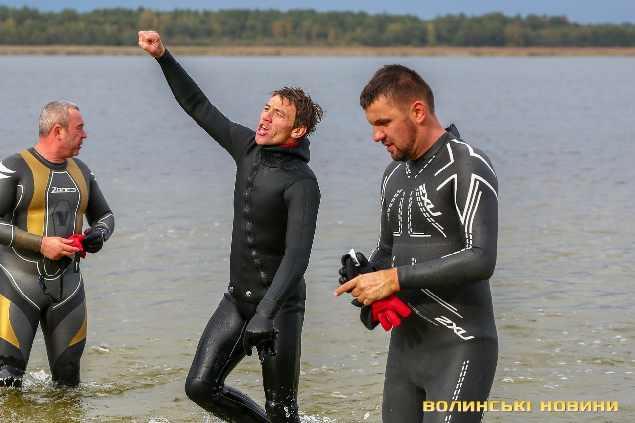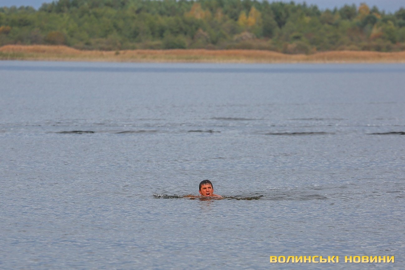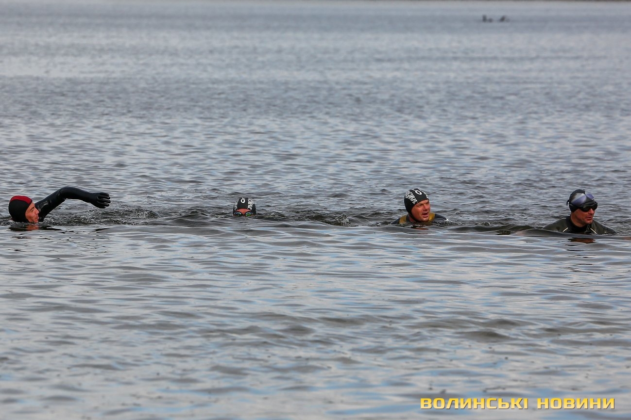 Учасники заходять у воду, починається заплив. Пливуть, до слова, доволі швидко. «Знаючі» люди кажуть – аби не замерзнути, змушені рухатись швидше. Тому вже за півгодини перша шістка учасників долає півторакілометрову дистанцію зі східного берега озера та прибуває на центральний пляж. Серед них - житель Турійського району та вчитель фізкультури Леонід Гаврилюк, який плив без гідрокостюма.На «фініші» Ігор Палиця поділився враженнями із присутніми про заплив, мовляв, відчуття після цього чудові. «Сподіваюся, що такі акції будуть регулярними. Бо озеро Світязь знають багато не лише в Україні, а й за її межами. А от Згоранське озеро менш популярне. Тому треба його популяризувати і заохочувати туристів приїжджати сюди», - сказав голова облради. Зі свого боку нардеп Ігор Гузь підтвердив, що акція хороша: «Майбутнє - за молодими людьми, а молодь має бути здоровою. Тому власним прикладом ми демонструємо здоровий спосіб життя».