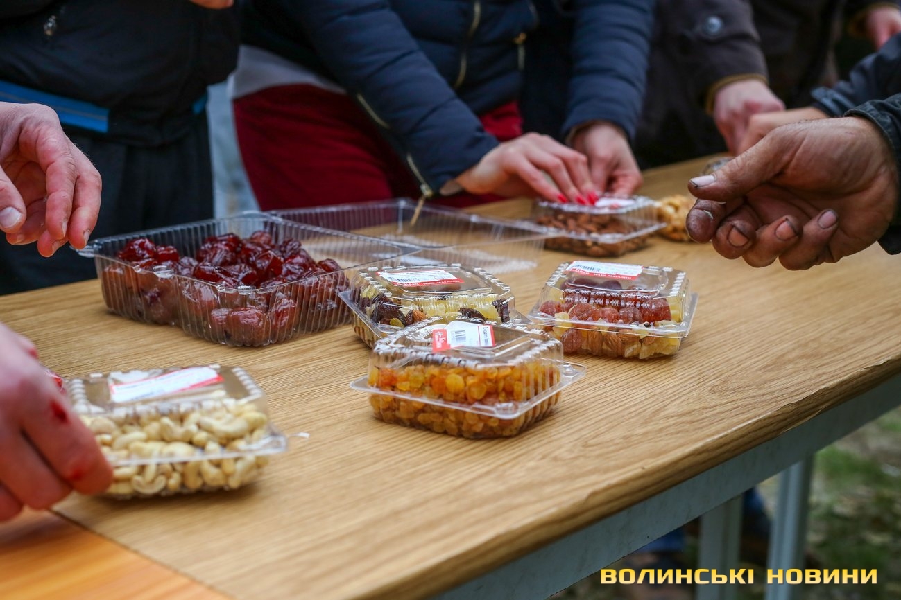 Також зазначив, що спортсмени після сильних фізичних виснажень не відразу відчувають голод. Проте, відновити запас речовин потрібно. Чудово для цього підійдуть сухофрукти та горіхи, якими залюбки пригощав пан Сергій. Для гостей дійства він привіз декілька видів горіхів, малину, сухофрукти, згущене молоко та інших смаколиків.