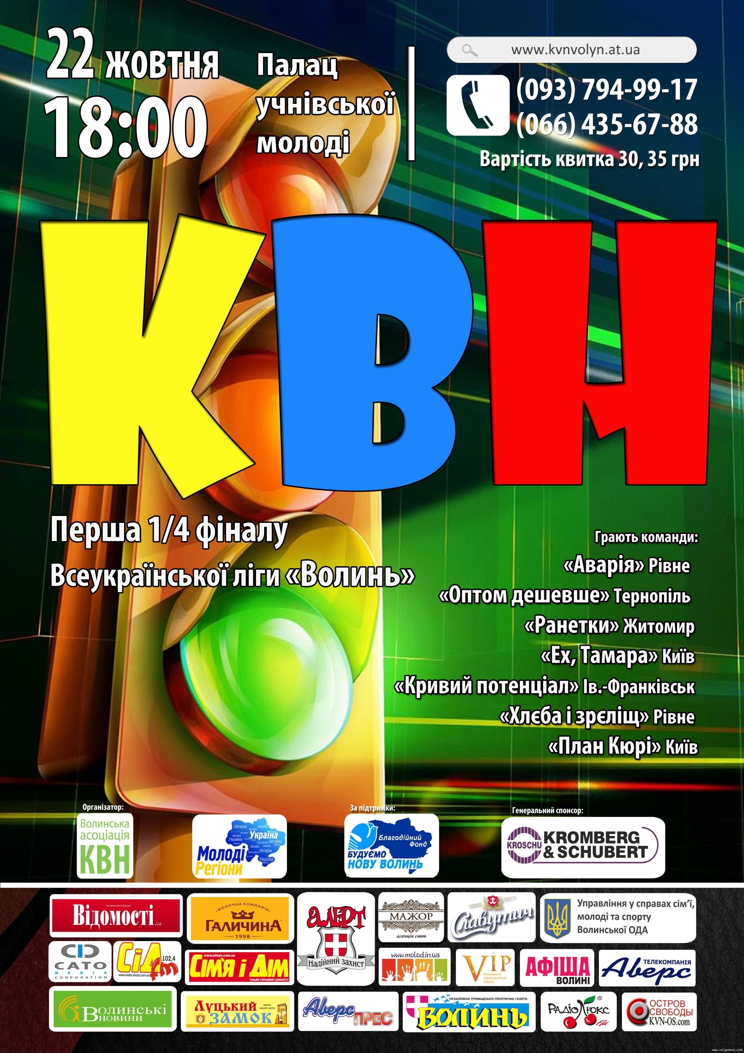 Перша чвертьфінальна гра Всеукраїнської ліги КВН «Волинь» відбудеться 22 жовтня о 18:00 в Палаці учнівської молоді Луцька.