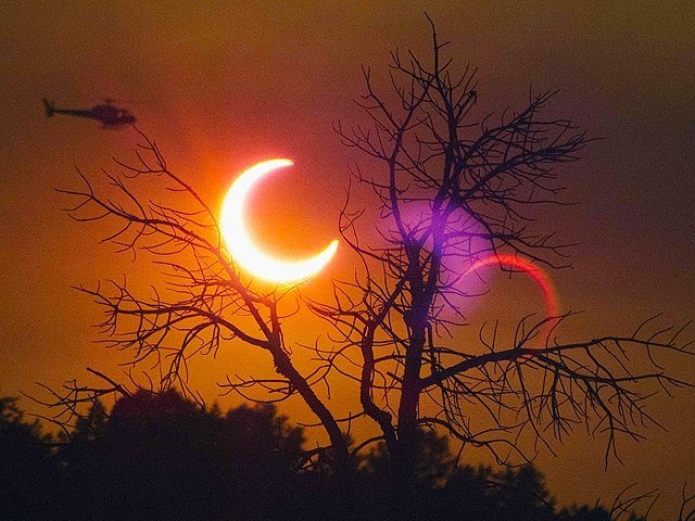 Вона зазначила, що при кільцеподібному затемненні Місяць закриває диск Сонця не повністю, а так, що по краях видно яскраву сонячну «облямівку», що оточує темний місячний диск.
