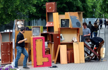 Барикаду зі старих меблів споруджують учасники фестивалю сучасного мистецтва «Art Territory» із польського міста Жешув на вулиці Лесі Українки