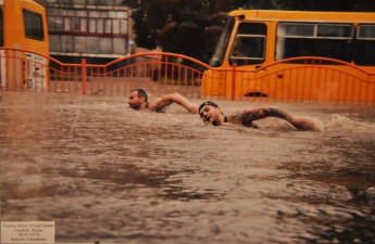 Фото чоловіків, які під час зливи у Луцьку в кінці липня гребуть вулицею, що наповнена водою, стали частиною світової кампанії.
