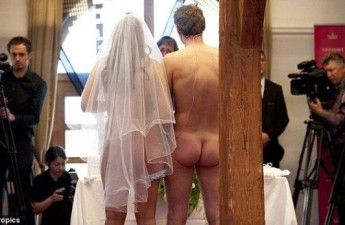 Австрійська пара влаштували собі «голе» весілля, з'явившись на церемонію практично без одягу – на нареченій була білизна тілесного кольору, фата і туфлі, а на нареченому лише капелюх.