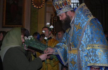 Після вечірньої служби у Свято-Троїцькому соборі Луцька владика Михаїл вручав прихожанкам квіти з нагоди свята Благовіщеня, який відзначатимуть 7 квітня
