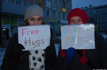 У Луцьку пройшов флеш-моб «Зігріймося обіймами»: юнаки та дівчата тримали у руках аркуші паперу з надписами «Обійми мене» та «Безкоштовні обійми», підходили до перехожих і просто обнімали їх