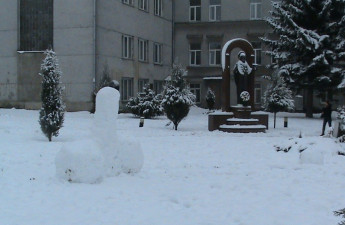 Неизвестные скульпторы-проказники вылепили возле здания городского совета Луцка снежную скульптуру загадочной формы.