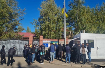 Сотні людей, які прибули в Астану з Криму через Росію, зібралися перед посольством України в Казахстані. Багато з них планують отримати закордонні паспорти.