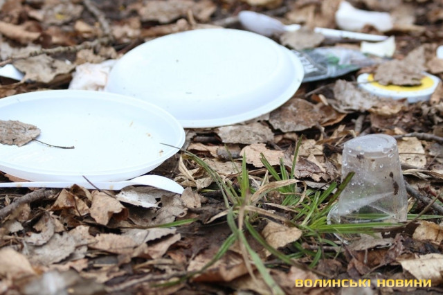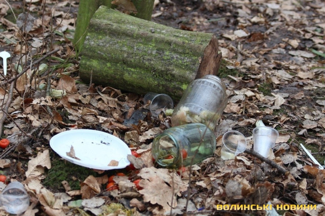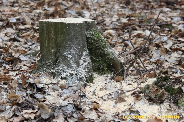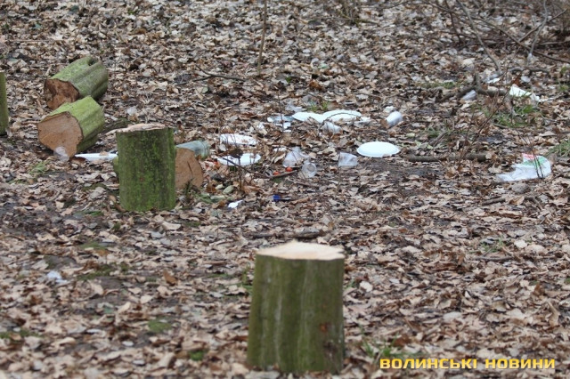 Сліди від коліс позашляховиків на пошкоджених поляхЗрізане дерево на місці відпочинку любителів швдкої їзди полями