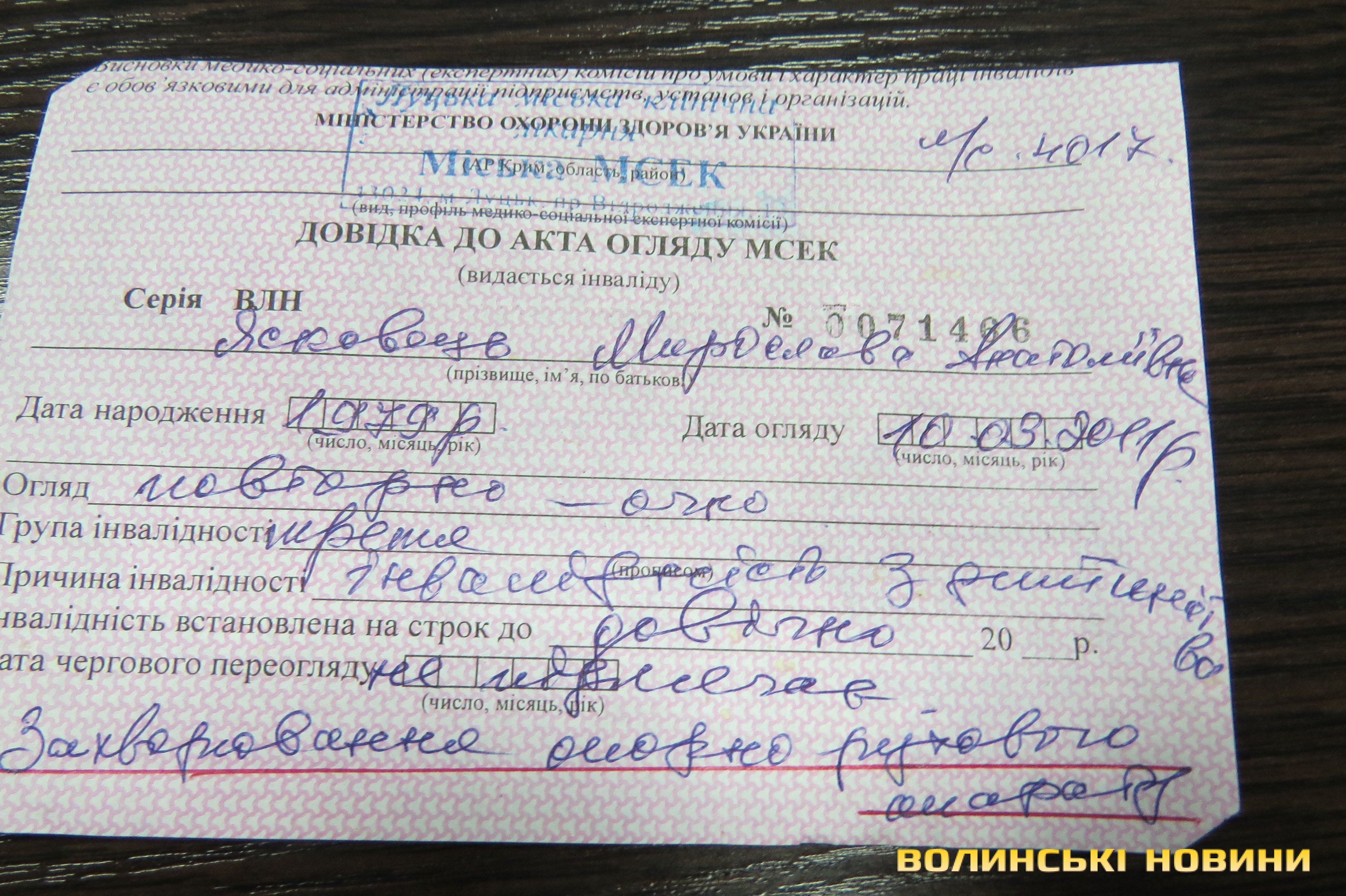 Зараз жінка безробітна. Колись вона працювала бухгалтером у магазині. Роботу довелося покинути, медики сказали, що їй не можна довго ходити, аби не навантажувати ноги.
