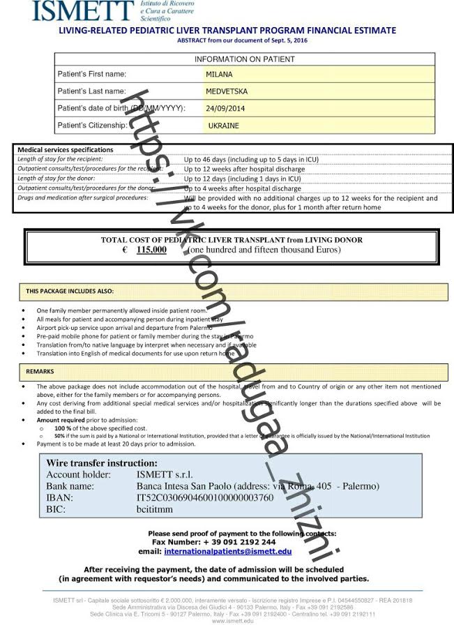«На данний час лише трансплантація печінки врятує життя моєї донечки. Донором буду я, мама. Зараз печінка Мілани працює на грані і в любий момент може відмовити, аналізи дуже погані. Тоді вона загине...Допоможіть, будь ласка, встигнути врятувати її життя. Нас погодились прооперувати в міжнародному центрі трансплантацій в Італії ISMETT. Сума, яка необхідна на операцію - 115 000 євро. Це величезна сума. Самі ми не зможемо, допоможіть нам...», - просить мама дівчинки.Номер телефону Ольги Проніної: 050 833 94 80.