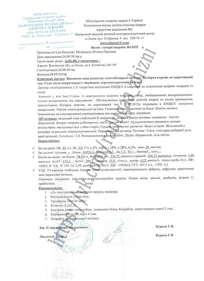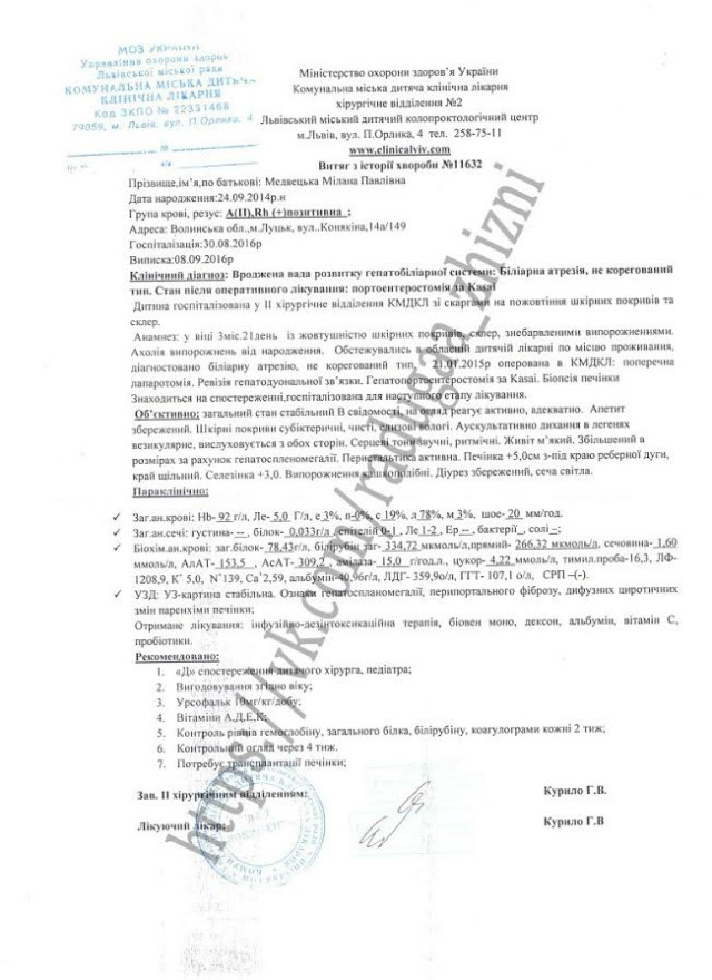 Як розповідає мама дівчинки Ольга Проніна, цироз розвинувся внаслідок вродженої вади гепатобіліарної системи - атрезії жовчовивідних шляхів. Мілана вже перенесла одну складну операцію - печінкову портоентеростомію (за Касаї). Їй було на той момент 4 місяці. Завдяки цій операції дитина змогла набрати вагу та зміцнити перед іншою складною операцією - трансплантацією печінки.