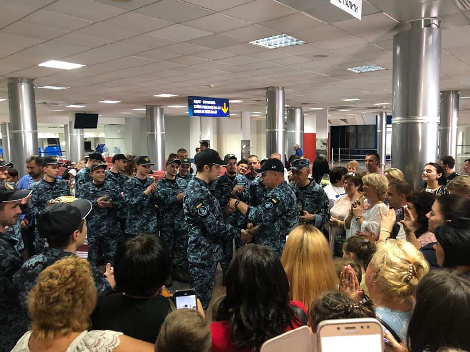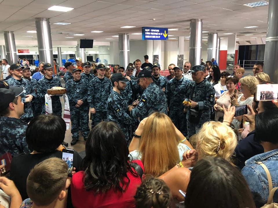 7 вересня в аеропорту «Бориспіль» українських військових моряків з полону зустрічали традиційним українським короваєм із сіллю та нагородами.