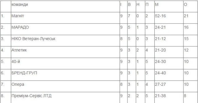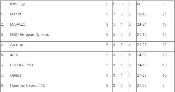 Отож підсумок туру вніс корективи у розташування команд в турнірній таблиці. Втрачені очки відкинули ветеранівців на третє місце, чим скористалася команда «МАРАДО», яка після чергової перемоги, перемістилася на другу сходинку. А розгромна перемога «Магніту» збільшила відрив їх від суперників на 5 очок і відкрила шлях до омріяних найвищих нагород цьогорічної першості.