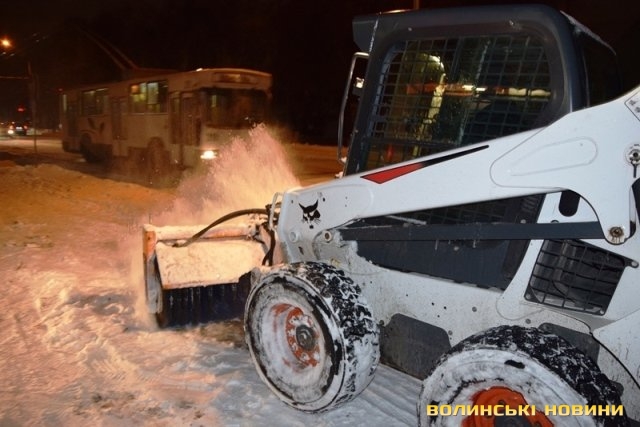 У Луцьку триває робота комунальних служб у зв’язку з інтенсивними сніговими опадами. Близько 100 працівників та 20 одиниць техніки чистять дороги та вулиці Луцька.