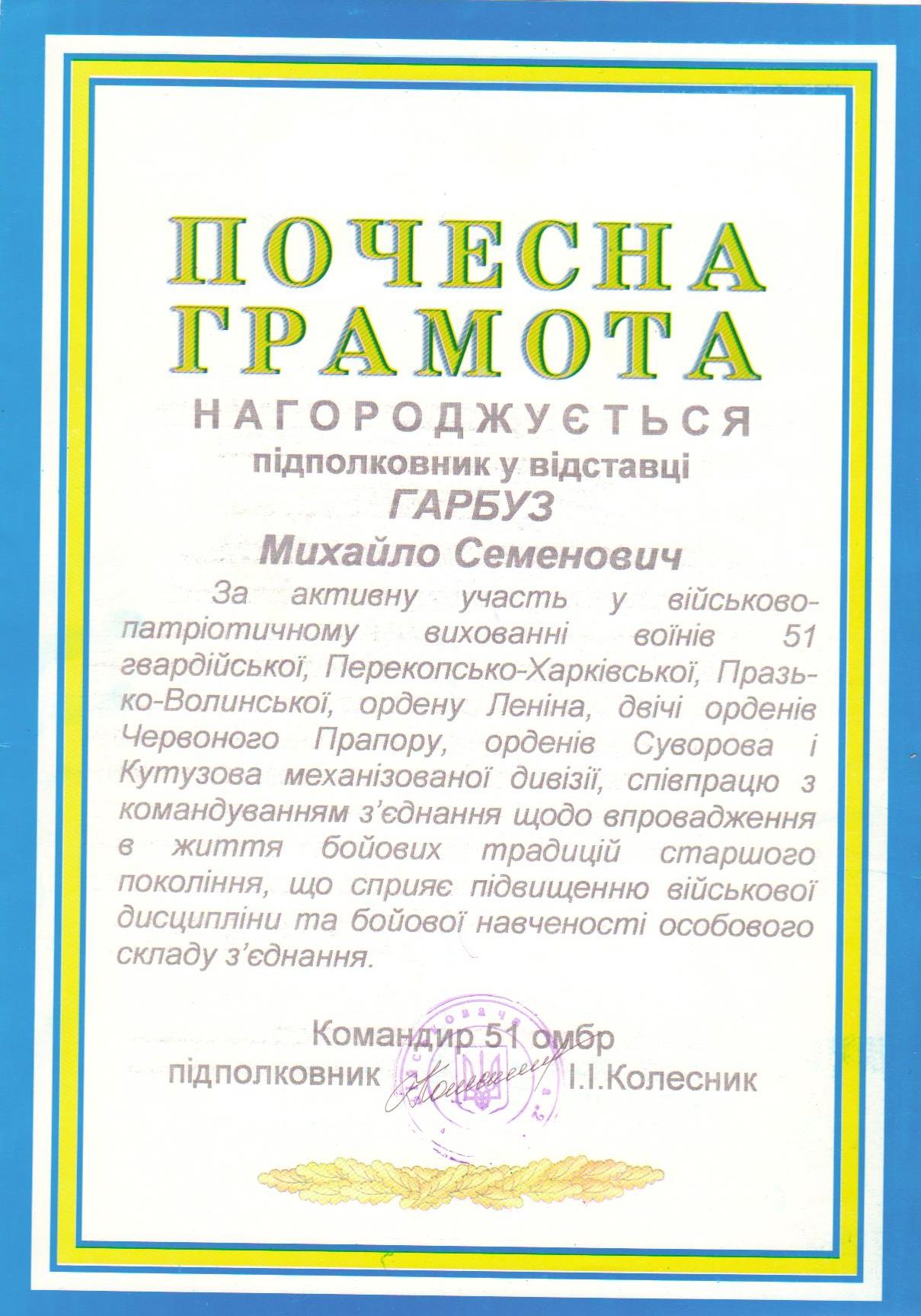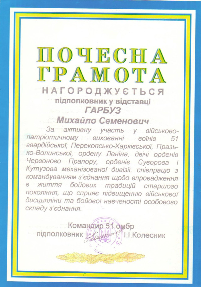 Та військова витримка, стійкість, простота та порядність пригодилися Михайлу Гарбузу на цивільних посадах - начальника міського житлового управління, начальника агентства «Укрдрук». Вже на пенсії ветеран не збавив в активності, а обирався головою Володимир-Волинської міськрайонної організації ветеранів війни та праці, збройних сил і правоохоронних органів, очолював Раду ветеранів 51-ої окремої бригади.